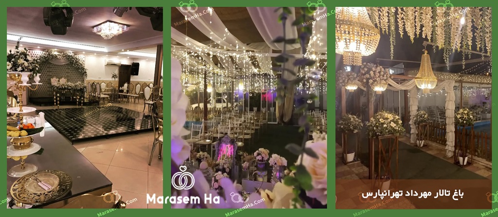 باغ تالار مهرداد یکی از مجلل ترین باغ تالارهای تهرانپارس است که فضایی خاص و رویایی برای برگزاری جشن های مختلف ارائه می دهد. این مجموعه دارای دو سالن مدرن با ظرفیت 50 تا 300 نفر، فضایی مناسب برای مراسم های کوچک و متوسط را فراهم می کند. همچنین یکی از ویژگی های این مجموعه امکان برگزاری مراسم عقد در فضایی روباز و سرپوشیده می باشد. فضای باز آن با استفاده از آبنما، استخر و آلاچیق طراحی شده است.